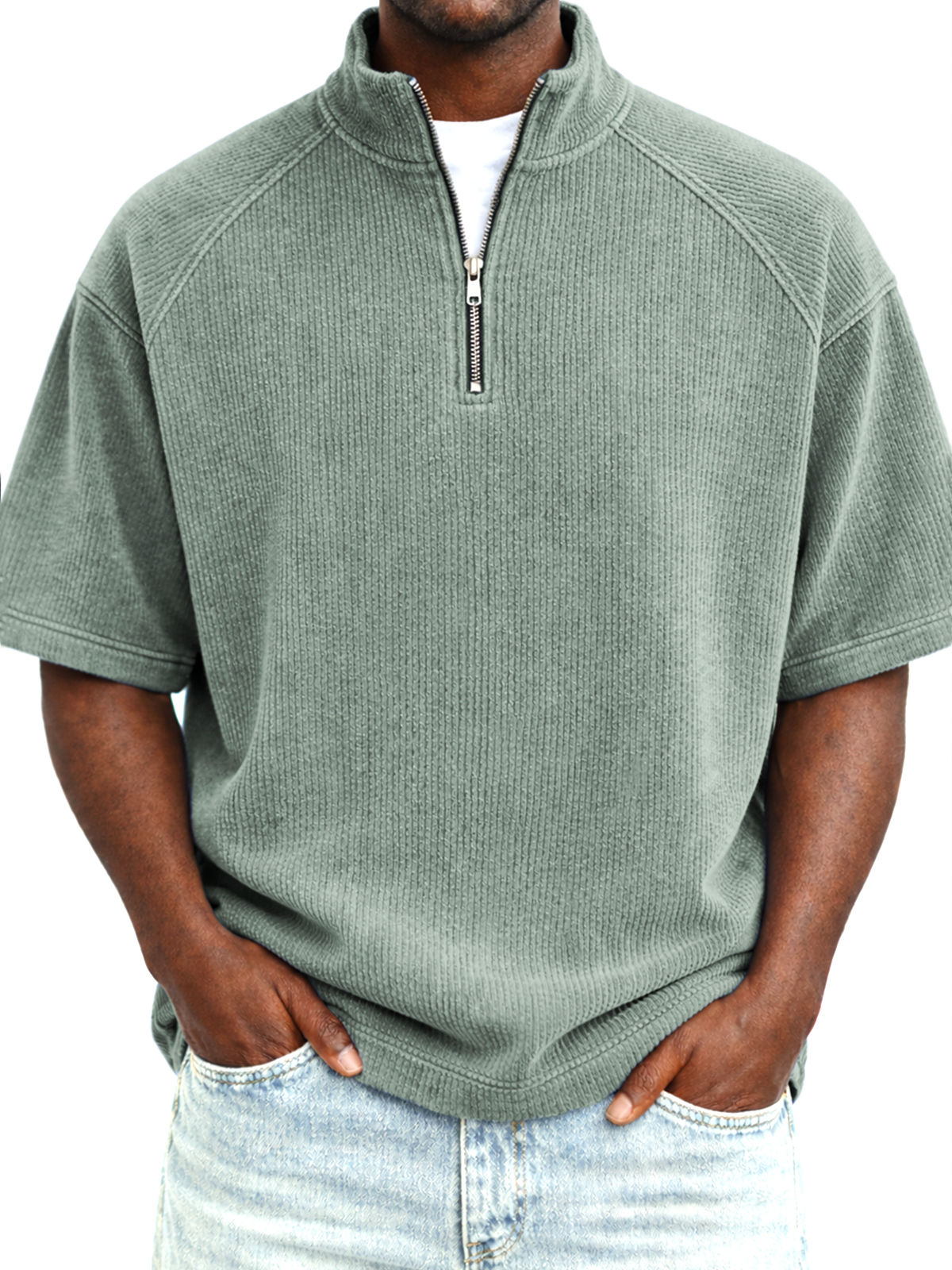 Men's Retro Raglan Corduroy Stand Collar Zipper Casual Short Sleeve T-Shirt