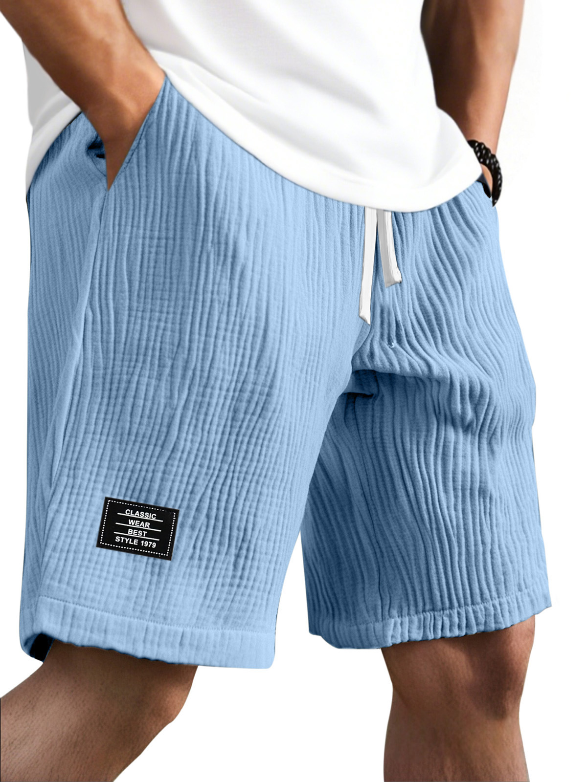 Men's casual solid color logo breathable pleated texture loose shorts