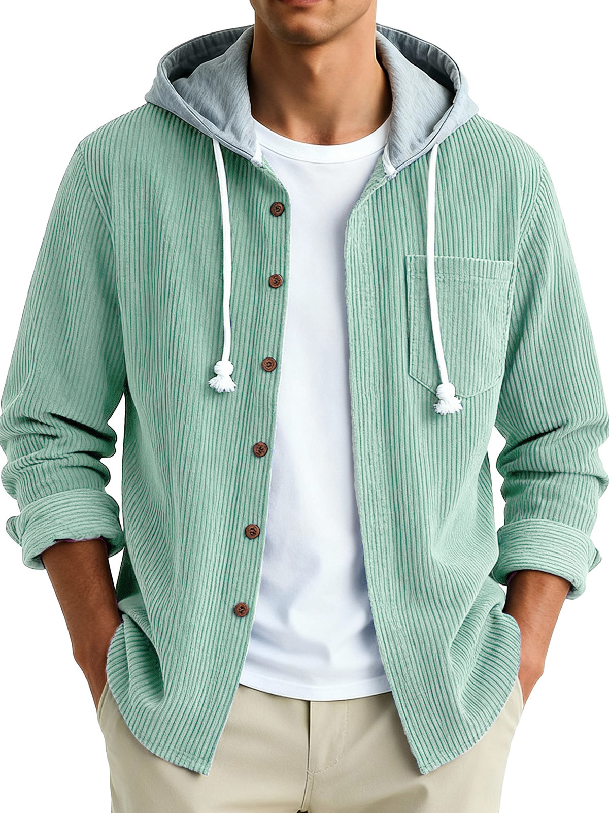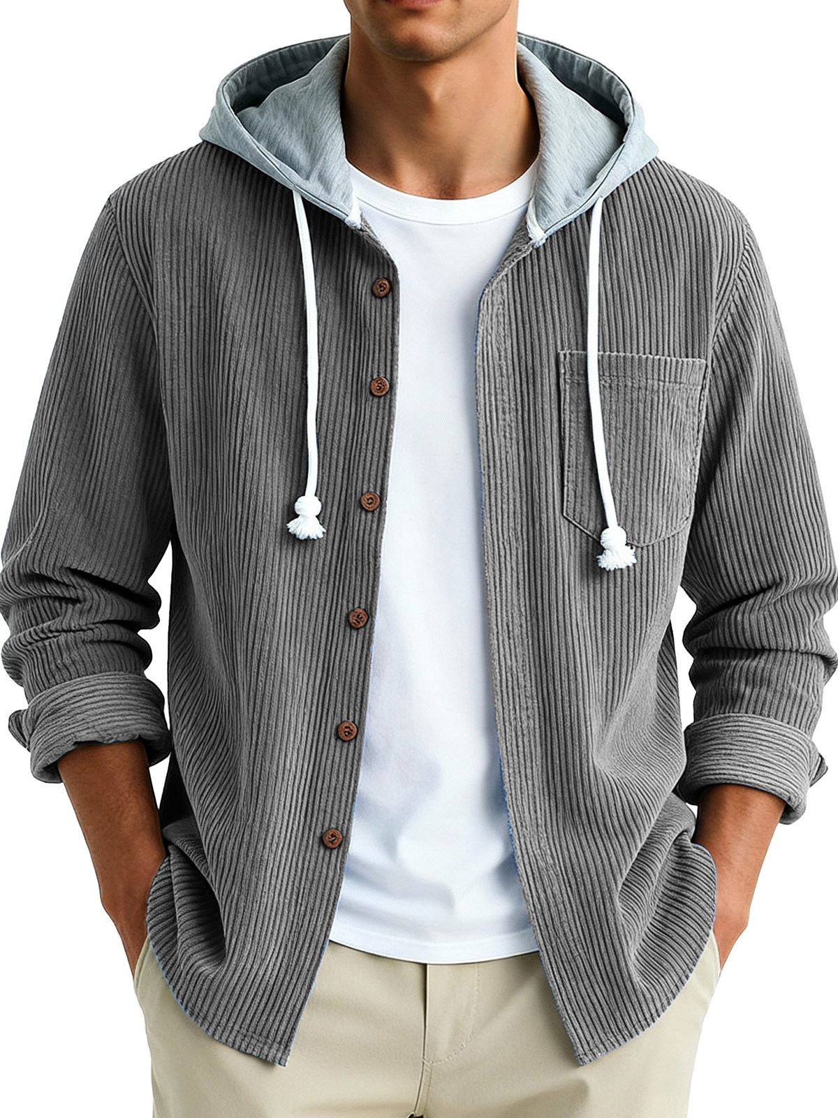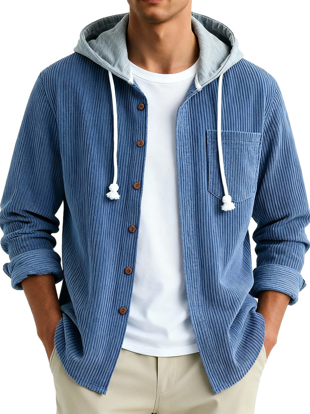 Men's Fashion Vintage Stitching Pit Strip Long Sleeve Pocket Hooded Shirt