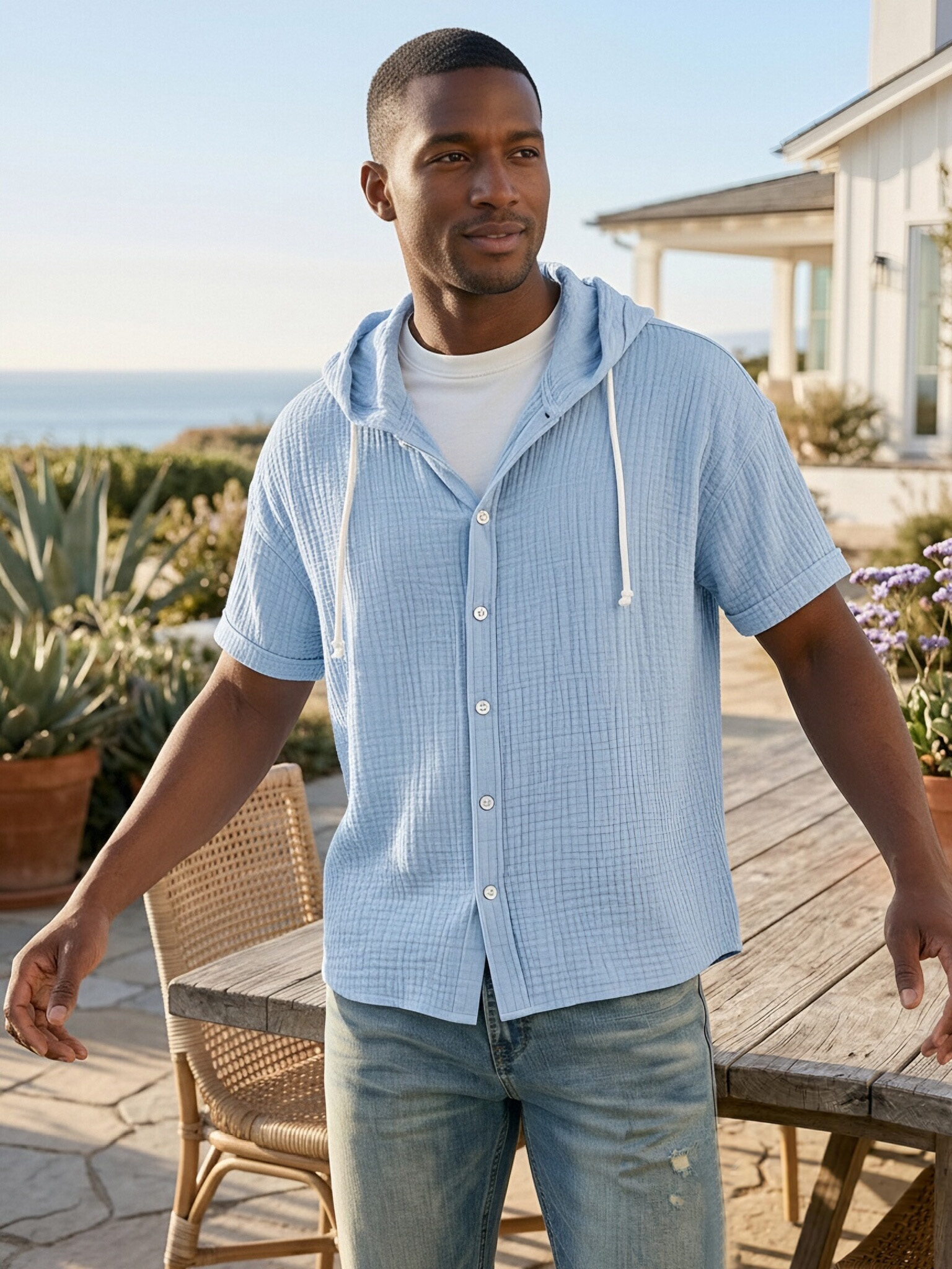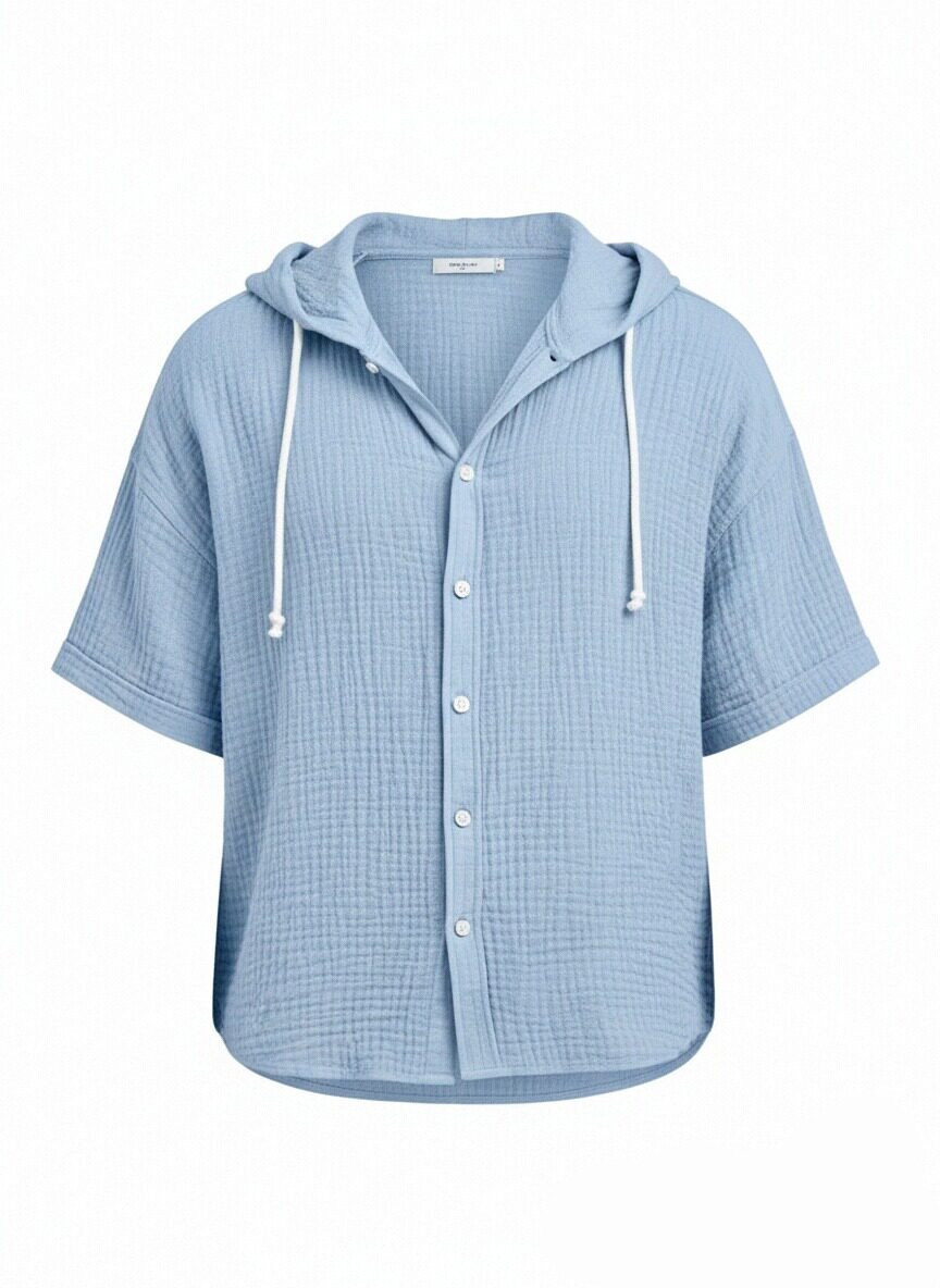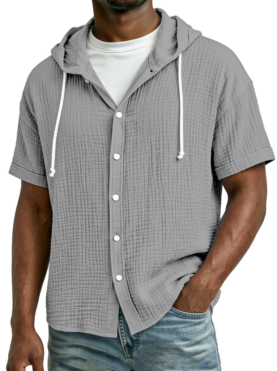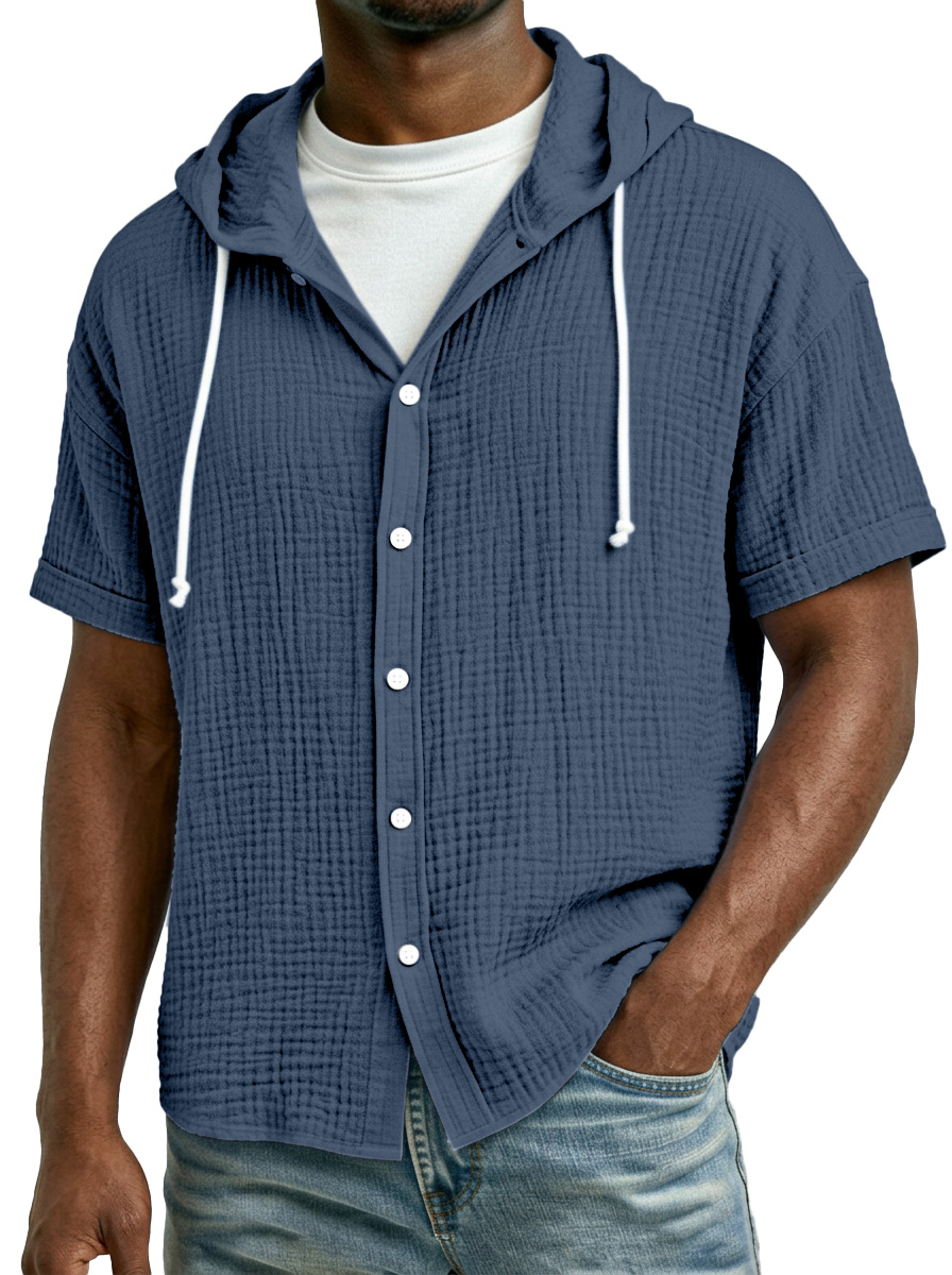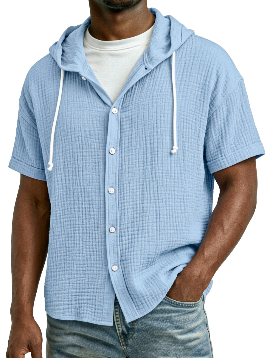 Men's Casual Resort Pleated Hooded Button-down Short Sleeve Shirt