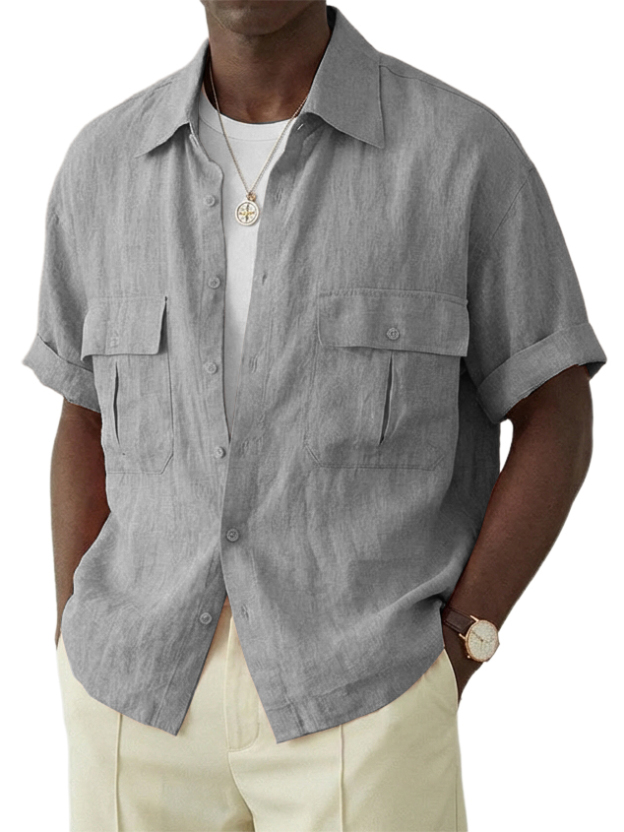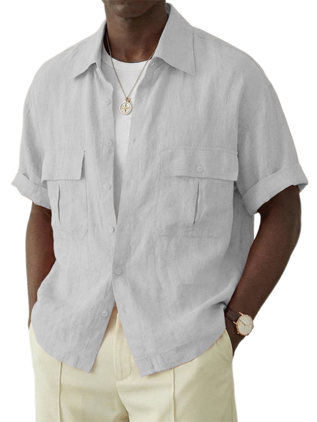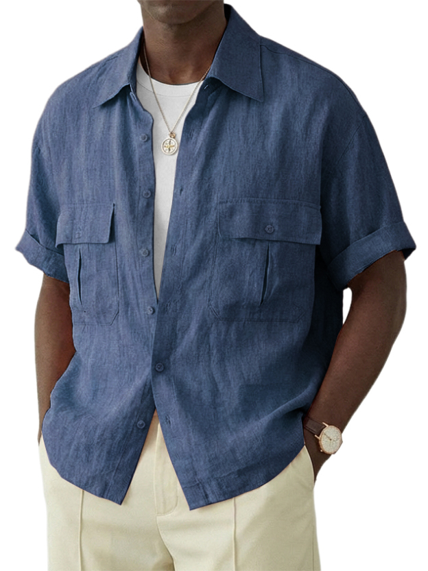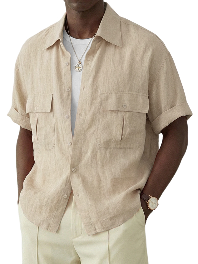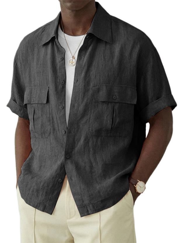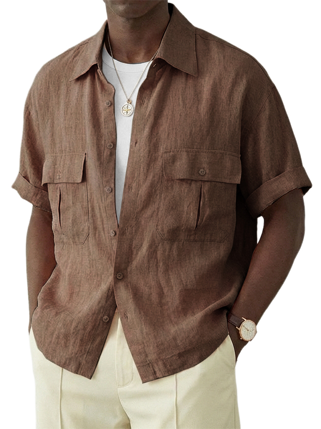 Men's Cotton Linen Double Pocket Workwear Short-Sleeve Shirt