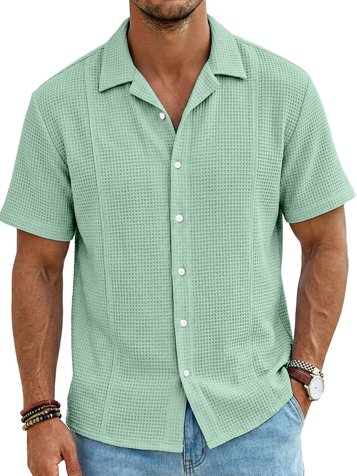Men's Resort Casual Waffle Deconstructed Cuban Collar Short Sleeve Shirt