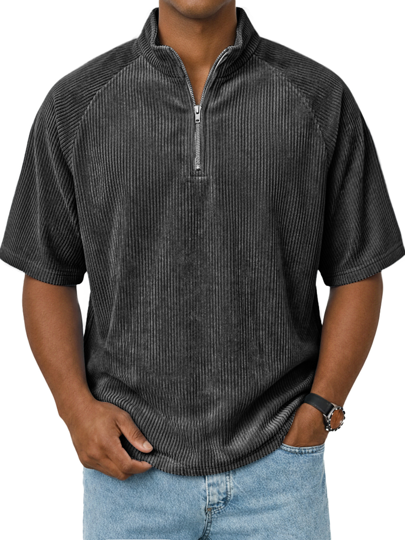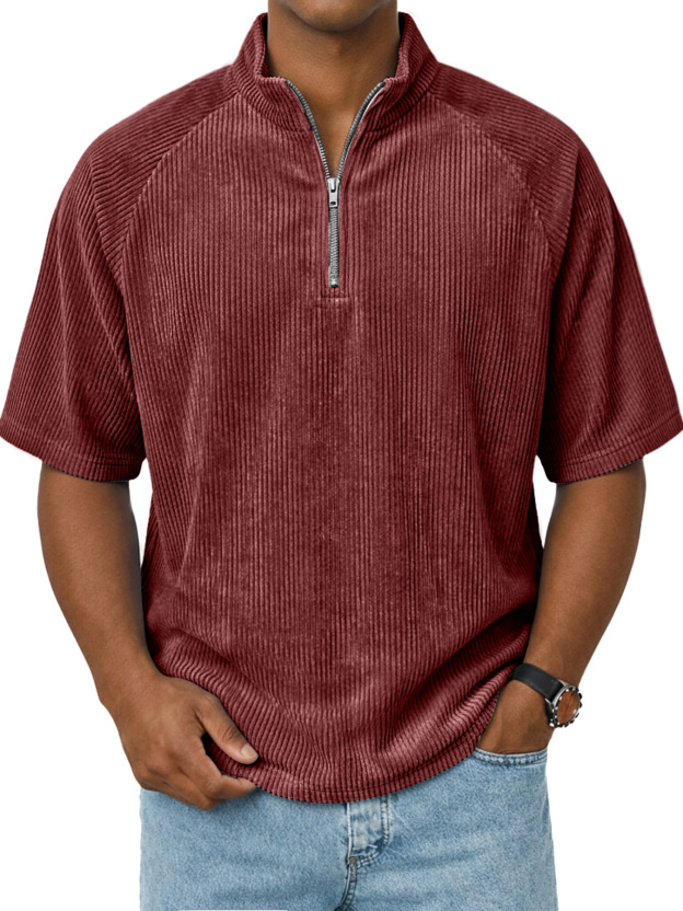 Men's Retro Raglan Corduroy Stand Collar Zipper Casual Short Sleeve T-Shirt