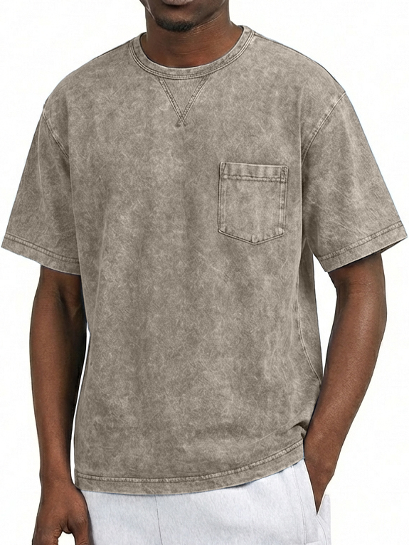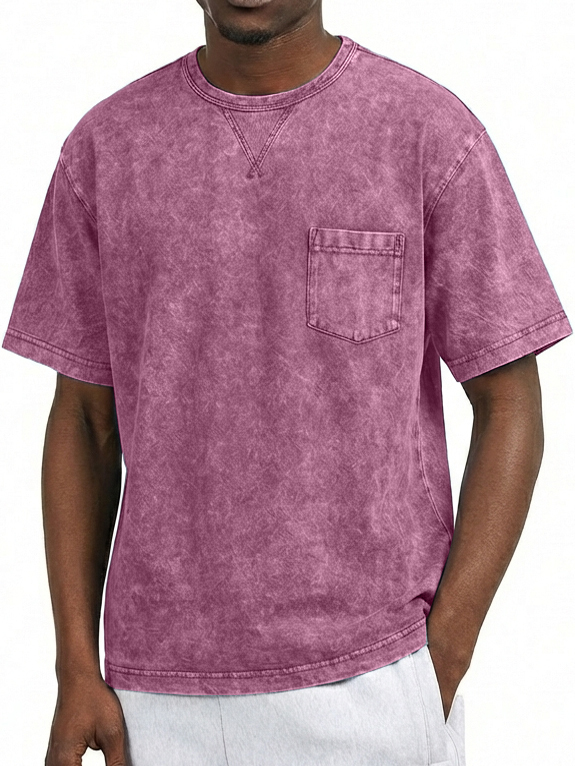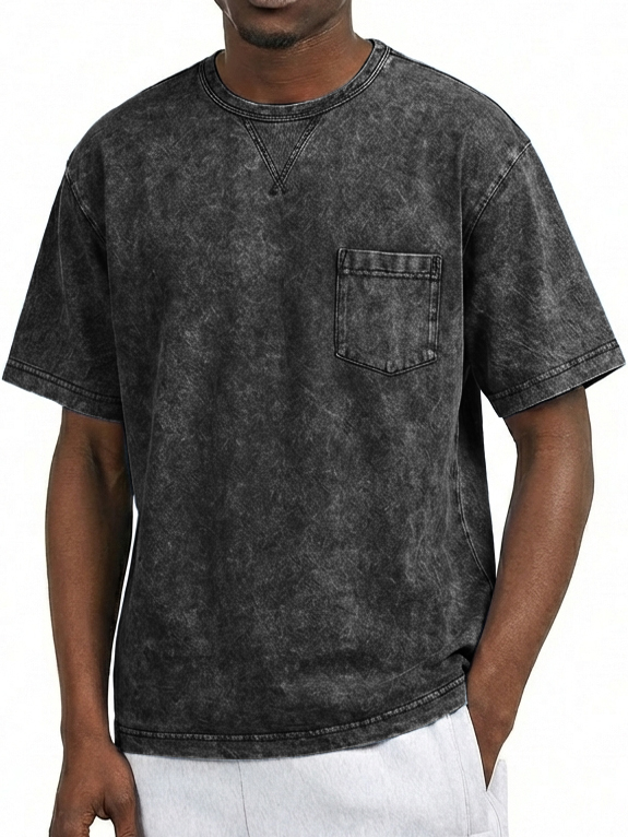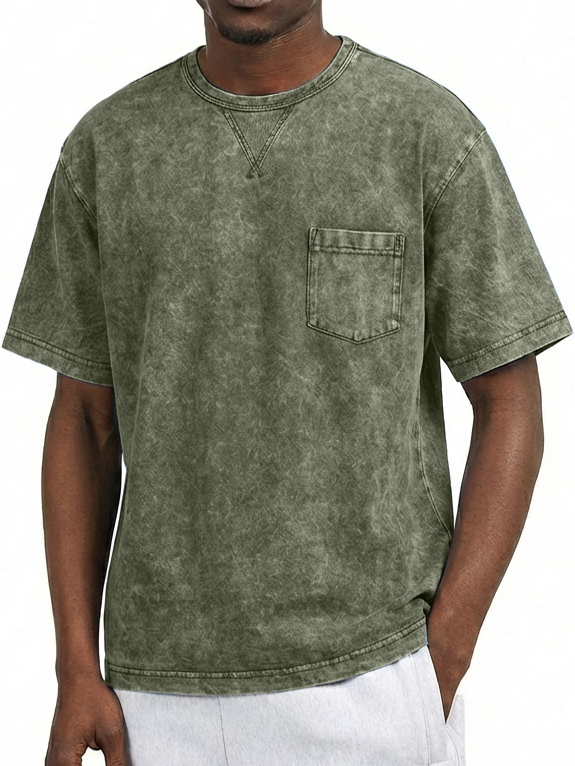 Men's Washed Distressed Cotton Retro Crew Neck Pocket Short-Sleeve T-Shirt